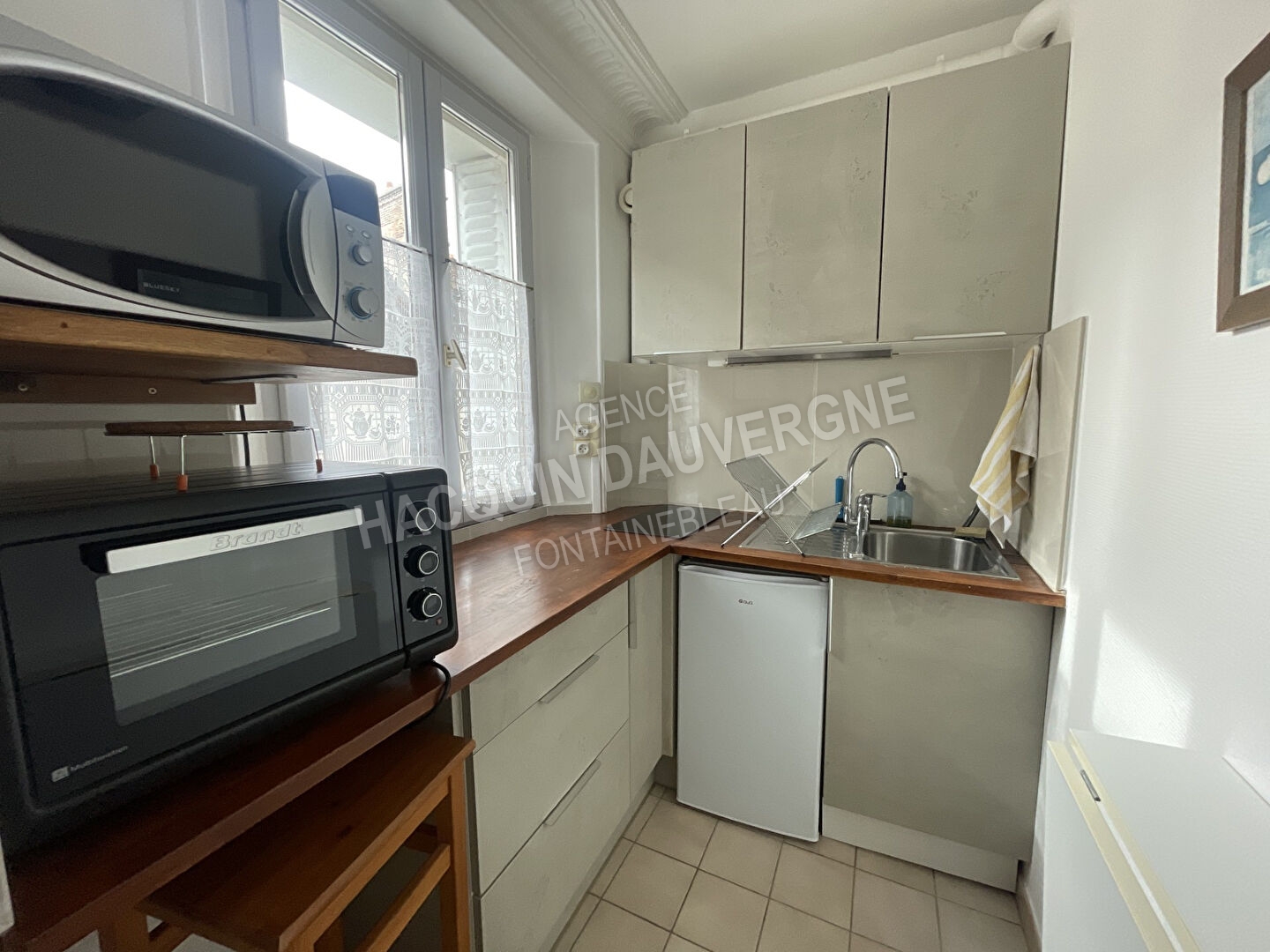 Fontainebleau centre, rue de France, au deuxième étage, un grand studio loué meublé de 24.43 m² composé d'une entrée, d'une pièce principale d'environ 16m² , un coin cuisine et d'une salle de bains avec wc.